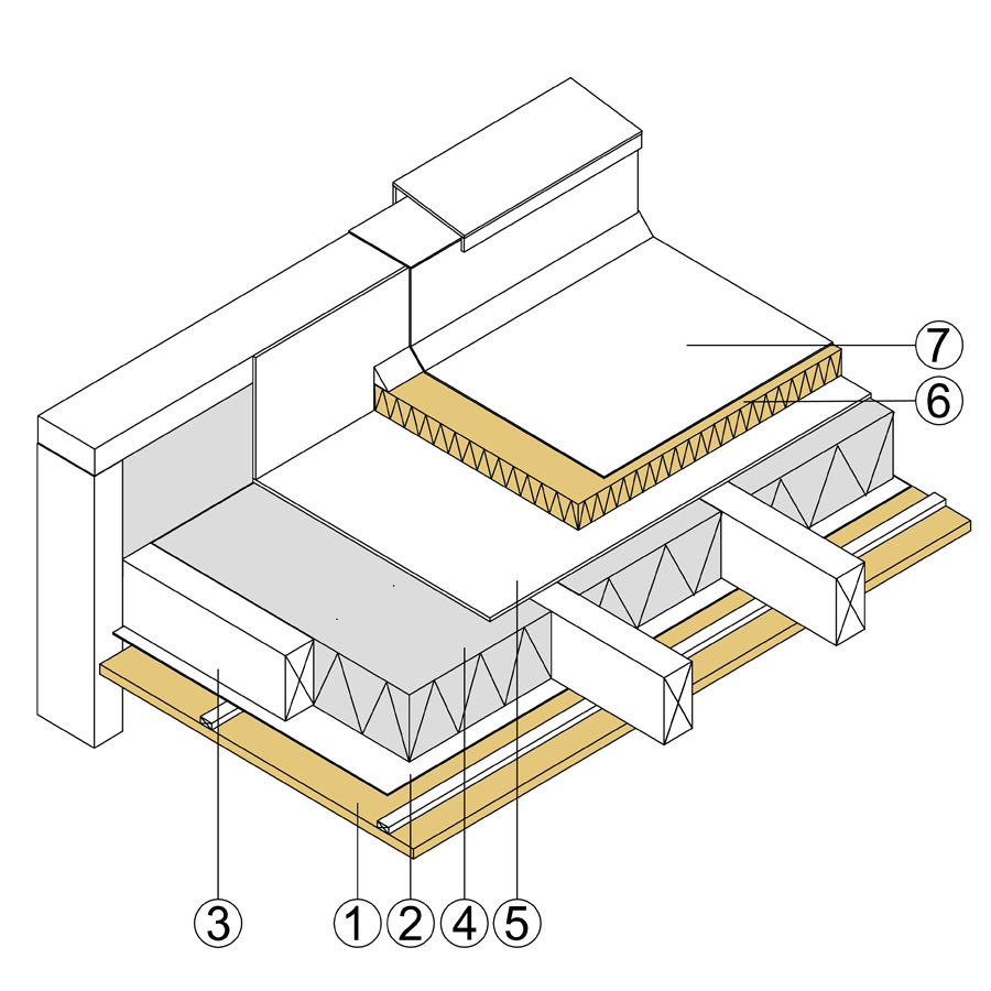 Izolacja stropodachu drewnianego w tradycyjnym układzie warstw polega na ułożeniu na stropie płyt VestaEco THERM umożliwiających chodzenie oraz na wypełnieniu przestrzeni między belkami włóknem VestaEco FLEX lub FIBRA.